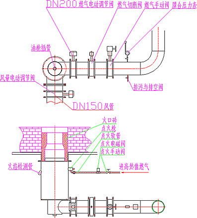 用戶必須配備4-6kg/cm2的壓縮空氣,同時配備點火用的液化氣罐,作切斷燃氣和點火用。燃燒器的火口磚用戶必須按照供方提供的圖紙來制作。